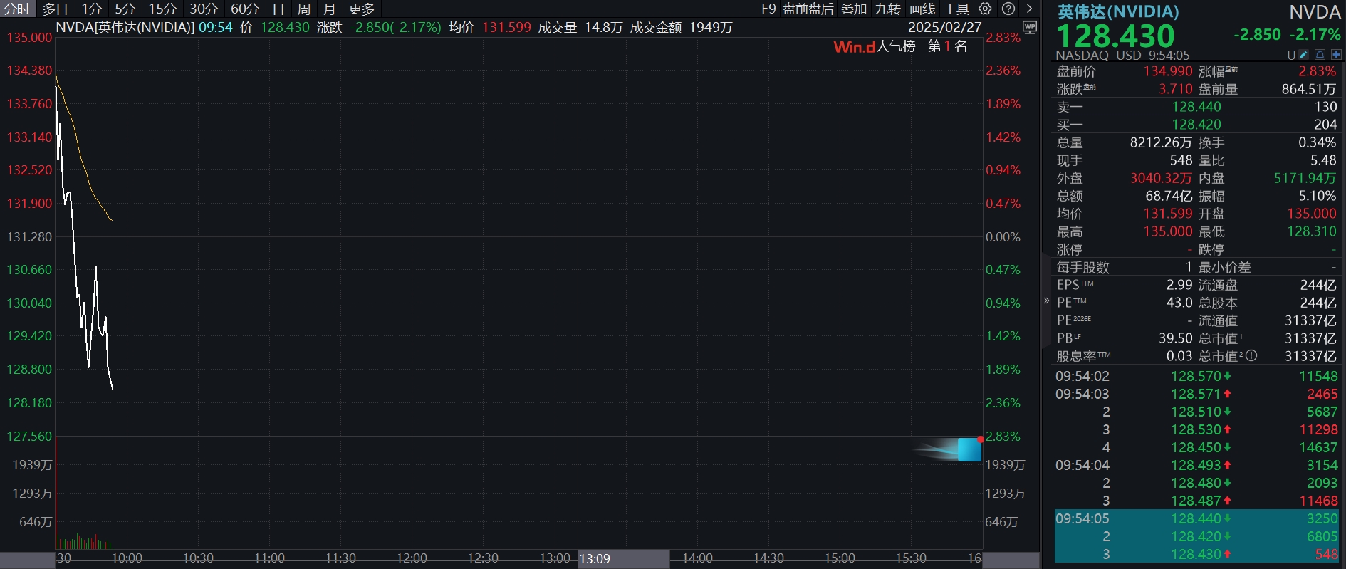 22:56 英伟达股价持续下挫,跌幅扩大至3%。